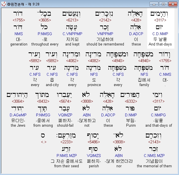 히브리어구약bhs,28 וְהַיָּמִים הָאֵלֶּה נִזְכָּרִים וְנַעֲשִׂים בְּכָל־דֹּור וָדֹור מִשְׁפָּחָה וּמִשְׁפָּחָה מְדִינָה וּמְדִינָה וְעִיר וָעִיר וִימֵי הַפּוּרִים הָאֵלֶּה לֹא יַעַבְרוּ מִתֹּוךְ הַיְּהוּדִים וְזִכְרָם לֹא־יָסוּף מִזַּרְעָם׃ ס