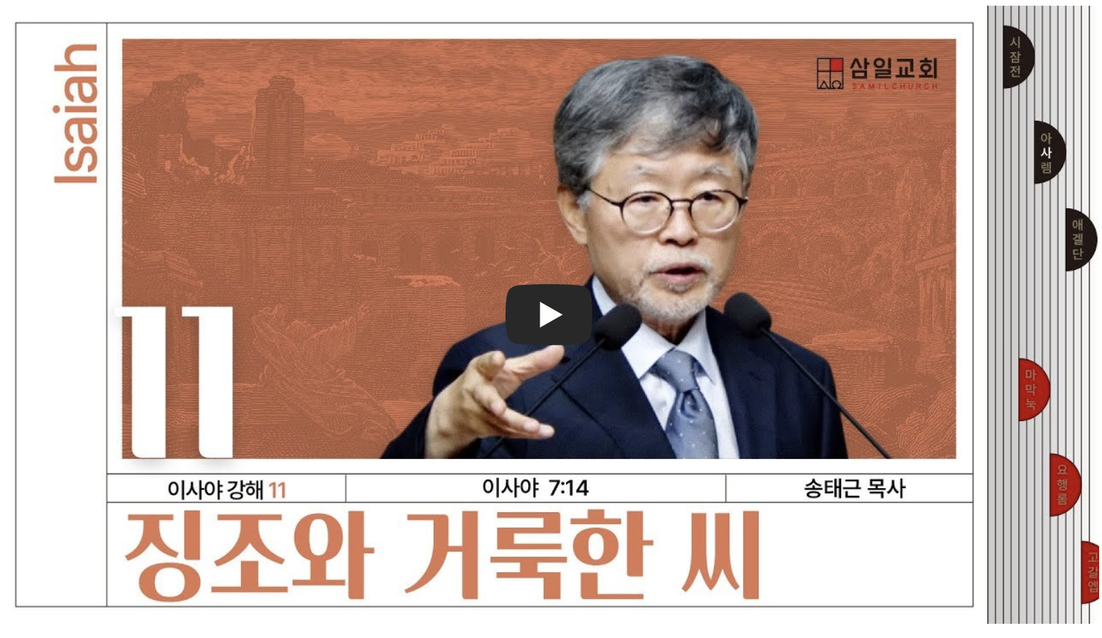 이사야 6장을 지나면서 우시아 왕이 죽은 해를 다뤘습니다. 그 해, 이사야는 성전에서 하나님의 영광을 보고, 자신이 속한 민족의 타락을 목도하면서 중요한 영적 깨달음을 얻습니다. 이사야가 본 세 가지 그림은 하나님의 영광, 인간의 죄, 그리고 구원의 소망을 나타냅니다.