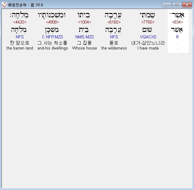 히브리어구약BHS,6 אֲשֶׁר־שַׂמְתִּי עֲרָבָה בֵיתֹו וּמִשְׁכְּנֹותָיו מְלֵחָה׃