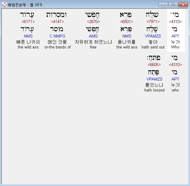히브리어구약BHS,5 מִי־שִׁלַּח פֶּרֶא חָפְשִׁי וּמֹסְרֹות עָרֹוד מִי פִתֵּחַ׃
