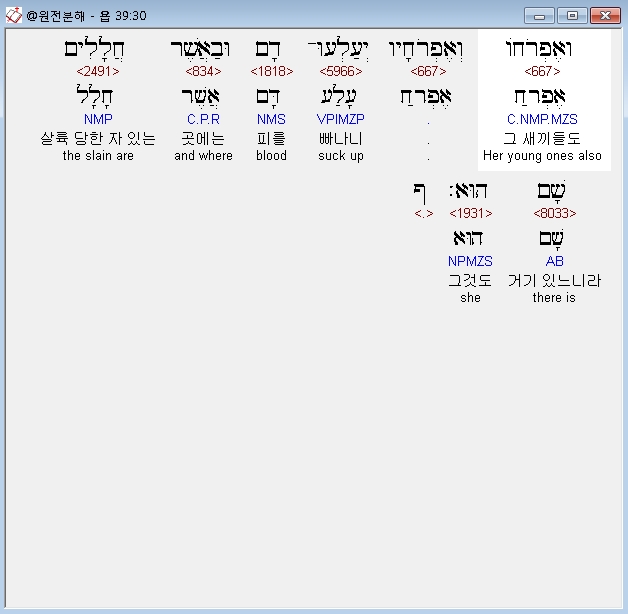 그 새끼들도 피를 빠나니 - '새끼들'에 해당하는 '에프로아흐'(*)는 '싹트다', '움트다', '발하다'란 뜻의 '파라흐'(*)에서 파생된 것으로 새의 새끼를 의미한다(신 22:6). 그리고 '빨다'로 번역된 히브리어 '알라'(*)는 그 어근이 불확실하여 그 의미를 정확히 알기는 어렵다. 혹자는 아랍어와 관련시켜서 '핥다'라는 뜻으로 해석하나(Dhorme), 새의 부리에는 어울리지 않는 표현이다. 그래서 다른 학자는 이를 독수리가 피를 섭취하기 위한 방법을 묘사한 것으로 이해하고, '뽑아내다'(extract)란 의미를 제안한다(Pope). 어쨌든 본절은 독수리의 새끼들이 동물의 몸에 있는 피를 먹는 습성이 있음을 묘사하고 있다. 한편, 하나님께서 이러한 동물의 잔인한 습성을 말씀하신 이유는 욥이 하나님 당신을 자신있게 판단하고 비난하고 있는 근거가 어디에 있는가를 집요하게 묻기 위해서인 듯하다.