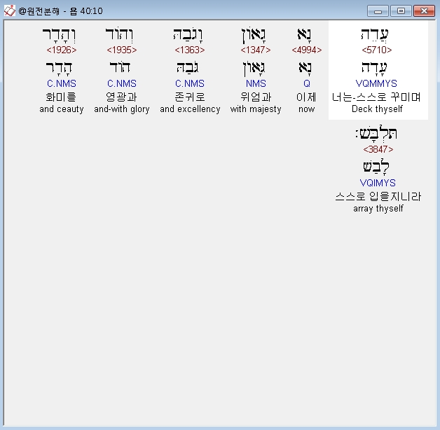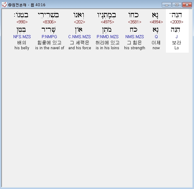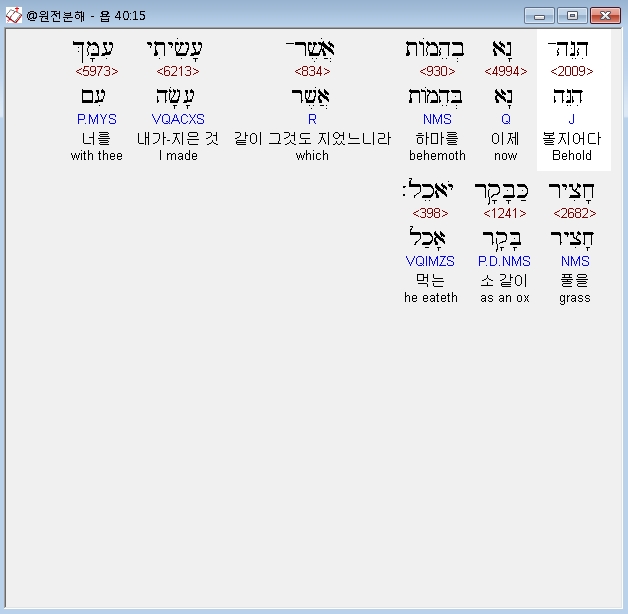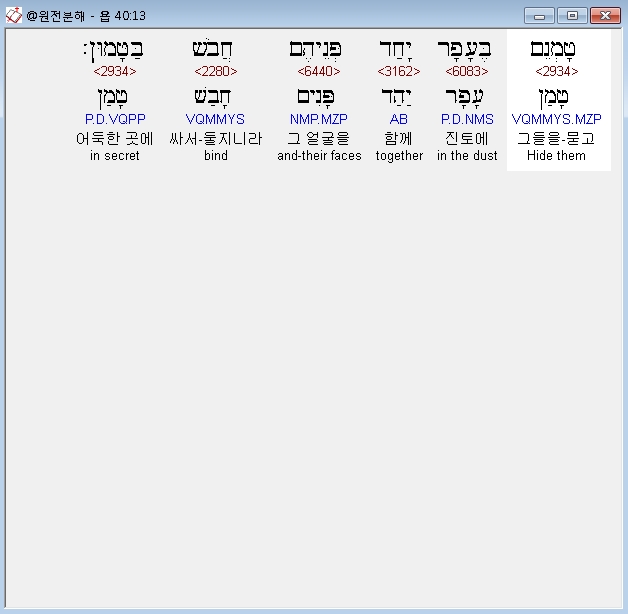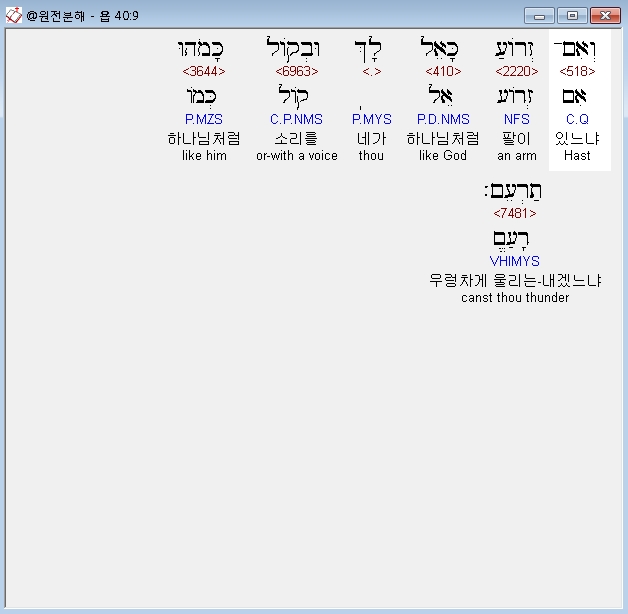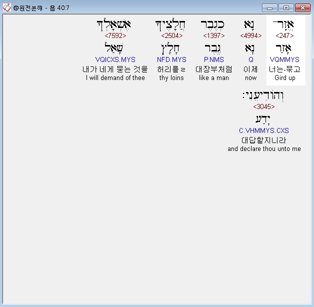 | 히브리어 욥기 38장 전체 원어 원문 성경 공부 주석 강해 설교 해설 해석 (0) | 2020.10.11 |