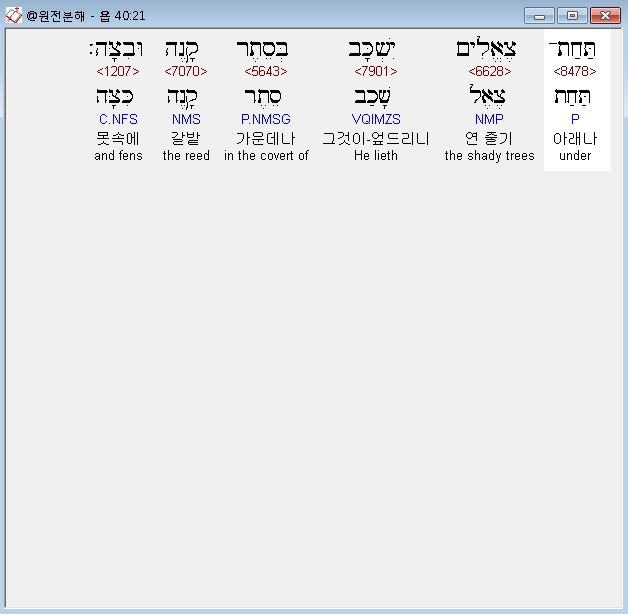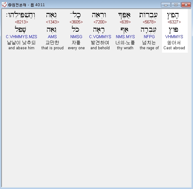 | 히브리어 욥기 41장 전체 원어 원문 성경 공부 주석 강해 설교 해설 해석 (0) | 2020.10.11 |