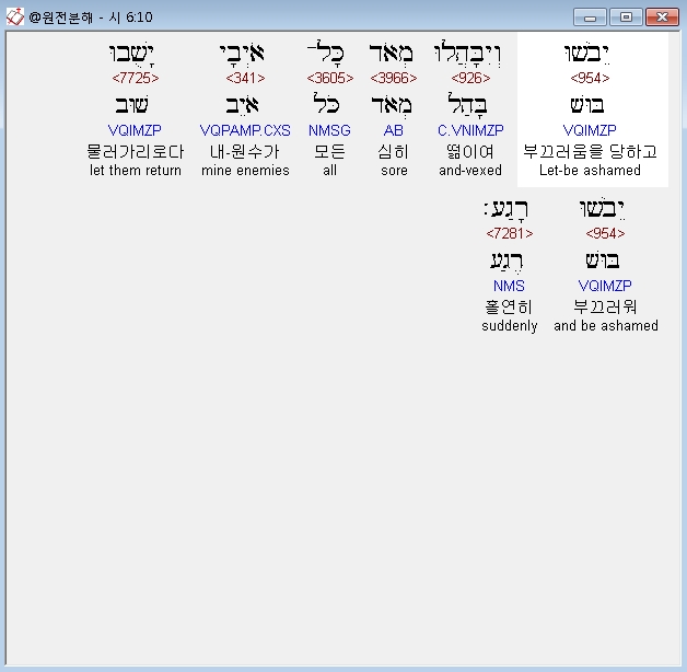 히브리어구약BHS,10 יֵבֹשׁוּ וְיִבָּהֲלוּ מְאֹד כָּל־אֹיְבָי יָשֻׁבוּ יֵבֹשׁוּ רָגַע׃