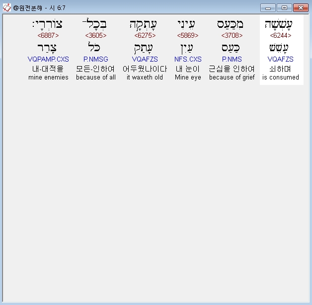 히브리어구약BHS,7 עָשְׁשָׁה מִכַּעַס עֵינִי עָתְקָה בְּכָל־צֹורְרָי׃