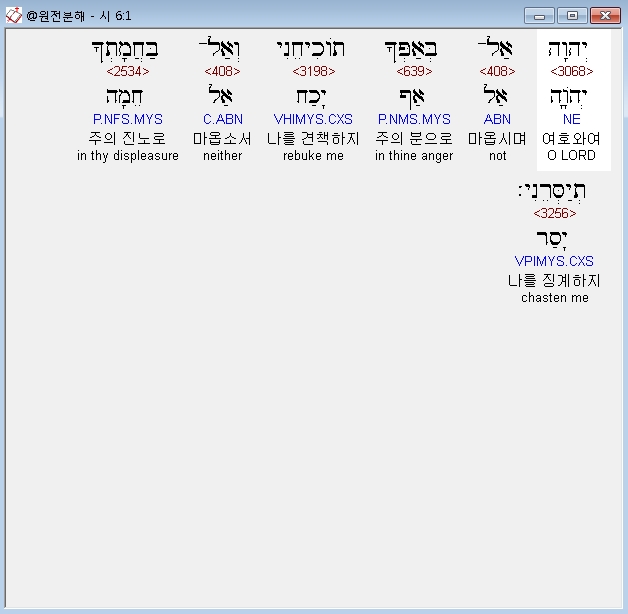 히브리어구약BHS,1 יְהוָה אַל־בְּאַפְּךָ תֹוכִיחֵנִי וְאַל־בַּחֲמָתְךָ תְיַסְּרֵנִי׃