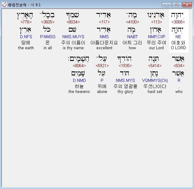 히브리어구약BHS,1 יְהוָה אֲדֹנֵינוּ מָה־אַדִּיר שִׁמְךָ בְּכָל־הָאָרֶץ אֲשֶׁר תְּנָה הֹודְךָ עַל־הַשָּׁמָיִם׃