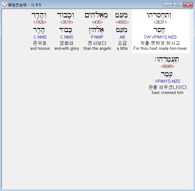 히브리어구약BHS,5 וַתְּחַסְּרֵהוּ מְּעַט מֵאֱלֹהִים וְכָבֹוד וְהָדָר תְּעַטְּרֵהוּ׃