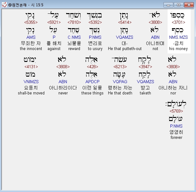 히브리어구약BHS,5 כַּסְפֹּו לֹא־נָתַן בְּנֶשֶׁךְ וְשֹׁחַד עַל־נָקִי לֹא לָקָח עֹשֵׂה־אֵלֶּה לֹא יִמֹּוט לְעֹולָם׃
