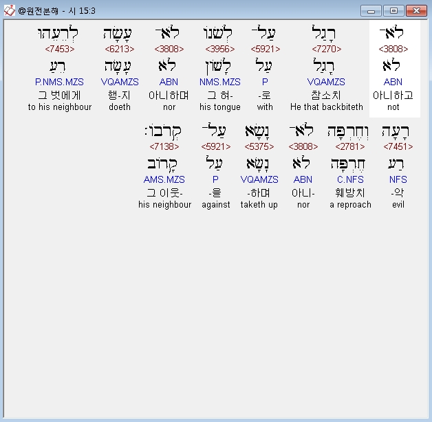 히브리어구약BHS,3 לֹא־רָגַל עַל־לְשֹׁנֹו לֹא־עָשָׂה לְרֵעֵהוּ רָעָה וְחֶרְפָּה לֹא־נָשָׂא עַל־קְרֹבֹו׃