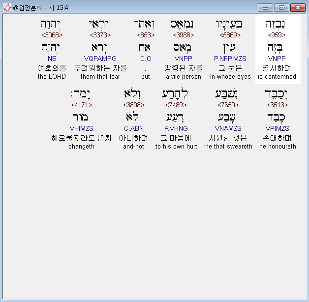 히브리어구약BHS,4 נִבְזֶה בְּעֵינָיו נִמְאָס וְאֶת־יִרְאֵי יְהוָה יְכַבֵּד נִשְׁבַּע לְהָרַע וְלֹא יָמִר׃