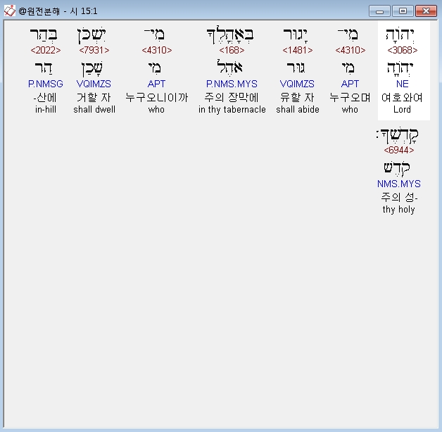히브리어구약BHS,1 מִזְמֹור לְדָוִד יְהֹוָה מִי־יָגוּר בְּאָהֳלֶךָ מִי־יִשְׁכֹּן בְּהַר קָדְשֶׁךָ׃