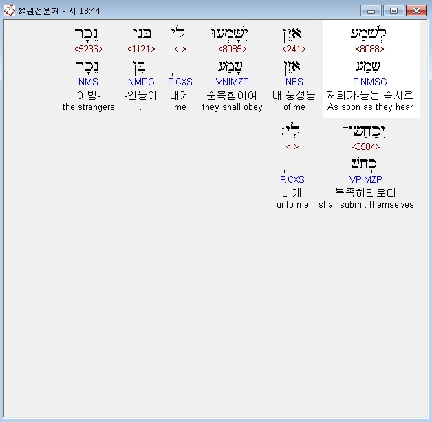 히브리어구약BHS,44 לְשֵׁמַע אֹזֶן יִשָּׁמְעוּ לִי בְּנֵי־נֵכָר יְכַחֲשׁוּ־לִי׃
