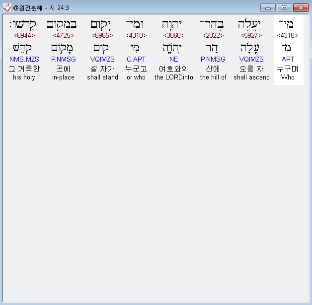 히브리어구약BHS,3 מִי־יַעֲלֶה בְהַר־יְהוָה וּמִי־יָקוּם בִּמְקֹום קָדְשֹׁו׃