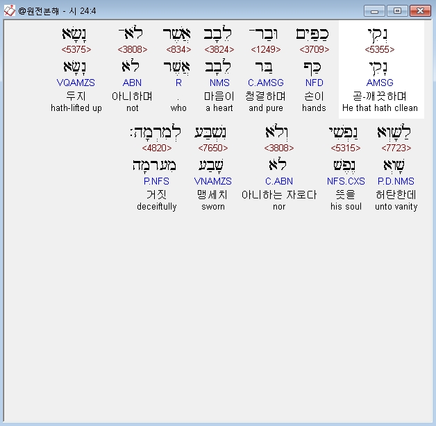 히브리어구약BHS,4 נְקִי כַפַּיִם וּבַר־לֵבָב אֲשֶׁר לֹא־נָשָׂא לַשָּׁוְא נַפְשִׁי וְלֹא נִשְׁבַּע לְמִרְמָה׃
