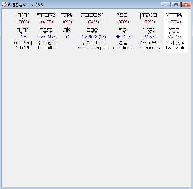 히브리어구약BHS,6 אֶרְחַץ בְּנִקָּיֹון כַּפָּי וַאֲסֹבְבָה אֶת־מִזְבַּחֲךָ יְהוָה׃