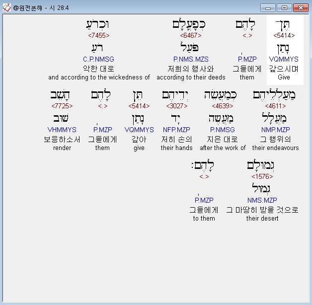 히브리어구약BHS,4 תֶּן־לָהֶם כְּפָעֳלָם וּכְרֹעַ מַעַלְלֵיהֶם כְּמַעֲשֵׂה יְדֵיהֶם תֵּן לָהֶם הָשֵׁב גְּמוּלָם לָהֶם׃