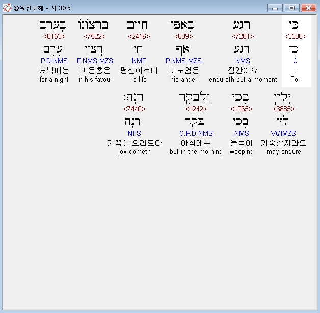 히브리어구약BHS,5 כִּי רֶגַע בְּאַפֹּו חַיִּים בִּרְצֹונֹו בָּעֶרֶב יָלִין בֶּכִי וְלַבֹּקֶר רִנָּה׃