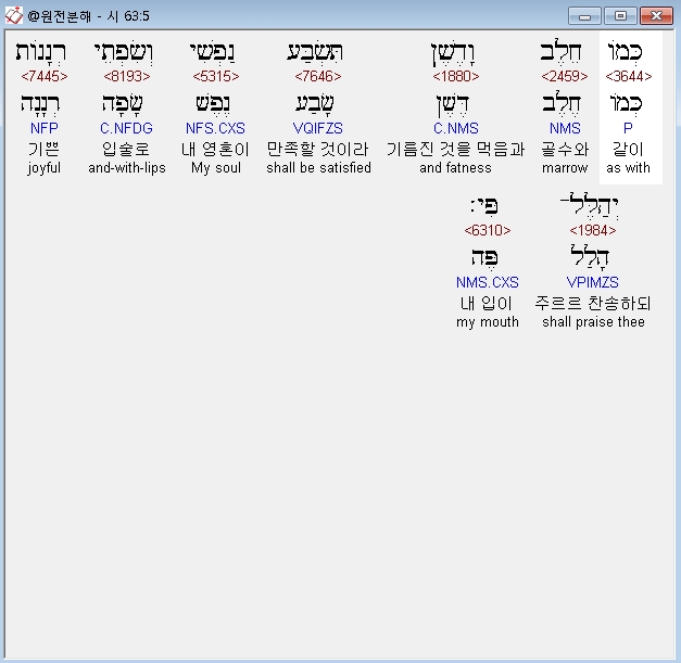 히브리어구약BHS,5 כְּמֹו חֵלֶב וָדֶשֶׁן תִּשְׂבַּע נַפְשִׁי וְשִׂפְתֵי רְנָנֹות יְהַלֶּל־פִּי׃