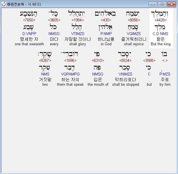 히브리어구약BHS,11 וְהַמֶּלֶךְ יִשְׂמַח בֵּאלֹהִים יִתְהַלֵּל כָּל־הַנִּשְׁבָּע בֹּו כִּי יִסָּכֵר פִּי דֹובְרֵי־שָׁקֶר׃