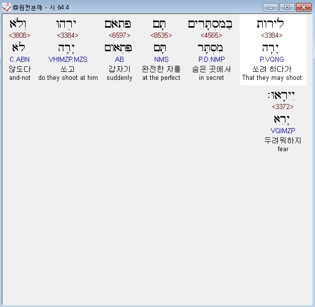 히브리어구약BHS,4 לִירֹות בַּמִּסְתָּרִים תָּם פִּתְאֹם יֹרֻהוּ וְלֹא יִירָאוּ׃