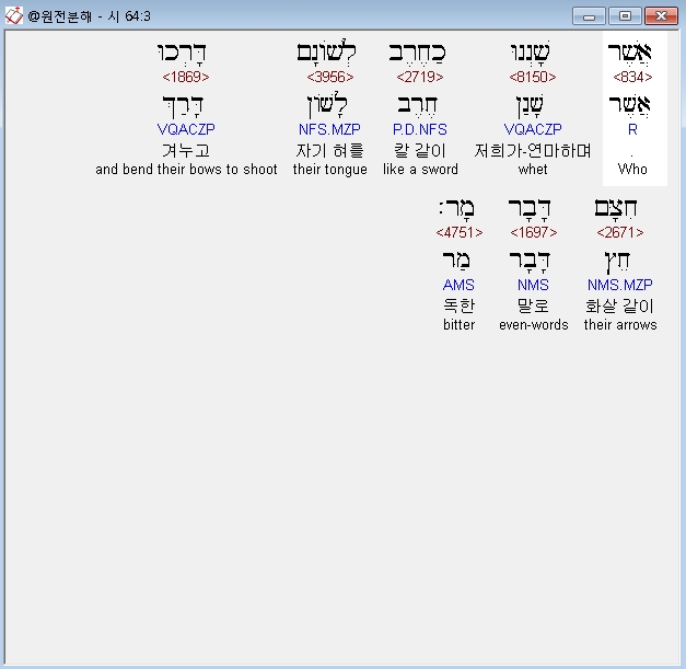 히브리어구약BHS,3 אֲשֶׁר שָׁנְנוּ כַחֶרֶב לְשֹׁונָם דָּרְכוּ חִצָּם דָּבָר מָר׃