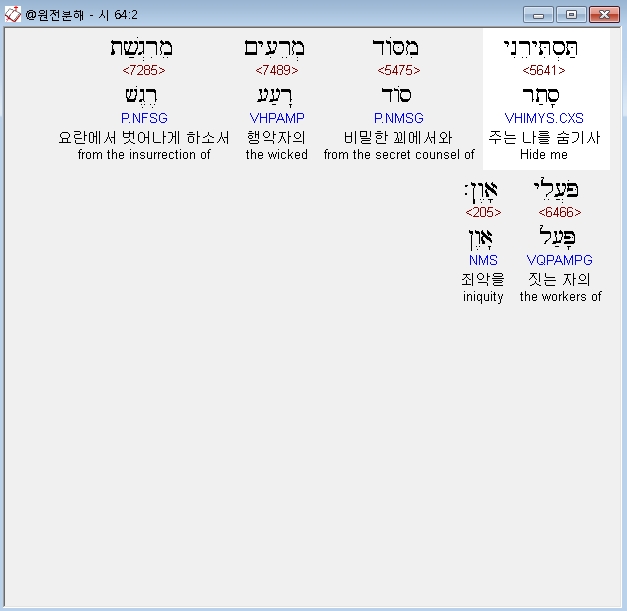 히브리어구약BHS,2 תַּסְתִּירֵנִי מִסֹּוד מְרֵעִים מֵרִגְשַׁת פֹּעֲלֵי אָוֶן׃