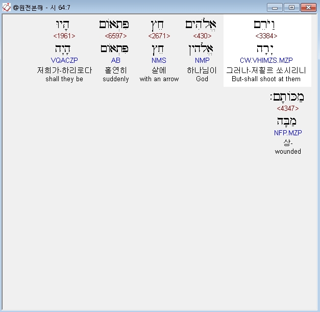 히브리어구약BHS,7 וַיֹּרֵם אֱלֹהִים חֵץ פִּתְאֹום הָיוּ מַכֹּותָם׃