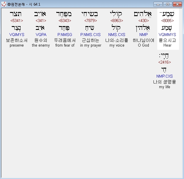 히브리어구약BHS,1 שְׁמַע־אֱלֹהִים קֹולִי בְשִׂיחִי מִפַּחַד אֹויֵב תִּצֹּר חַיָּי׃