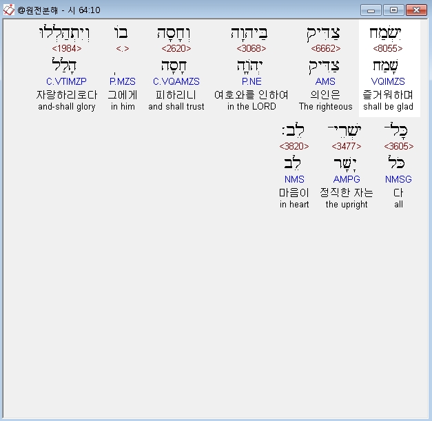 히브리어구약BHS,10 יִשְׂמַח צַדִּיק בַּיהוָה וְחָסָה בֹו וְיִתְהַלְלוּ כָּל־יִשְׁרֵי־לֵב׃