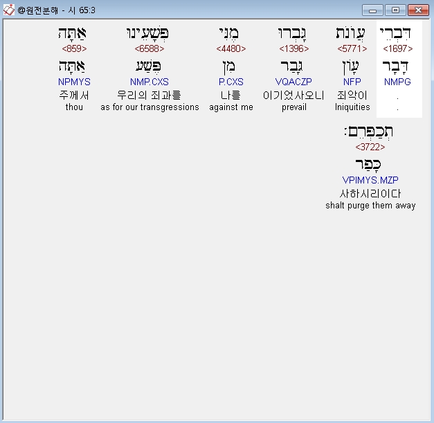 죄악이 나를 이기었사오니 - 혹자는 본구절을 조건절로 해석하여 '죄악이 나를 이겼다면' 혹은 '죄악이 나에게 벅찬 것이었다면'으로 번역하며, 또 어떤 학자는 시간을 나타내는 종속절로 해석하여 '우리가 죄악에 의해 압도되었을 때'(Kidener) 또는 '우리의 죄악이 우리를 이겼을 때'(Weiser)로 번역하였다. 그러나 히브리 본문에는 독립절이 사용되었으므로 개역 성경처럼 번역되는 것이 자연스럽다.