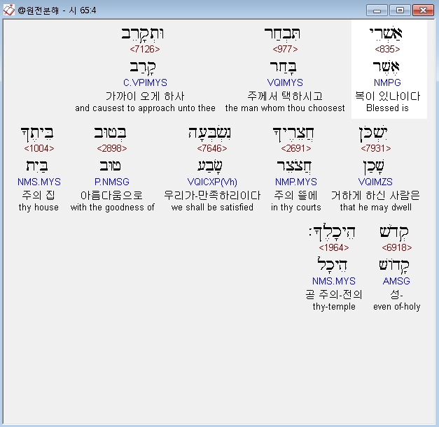 히브리어구약BHS,4 אַשְׁרֵי תִּבְחַר וּתְקָרֵב יִשְׁכֹּן חֲצֵרֶיךָ נִשְׂבְּעָה בְּטוּב בֵּיתֶךָ קְדֹשׁ הֵיכָלֶךָ׃