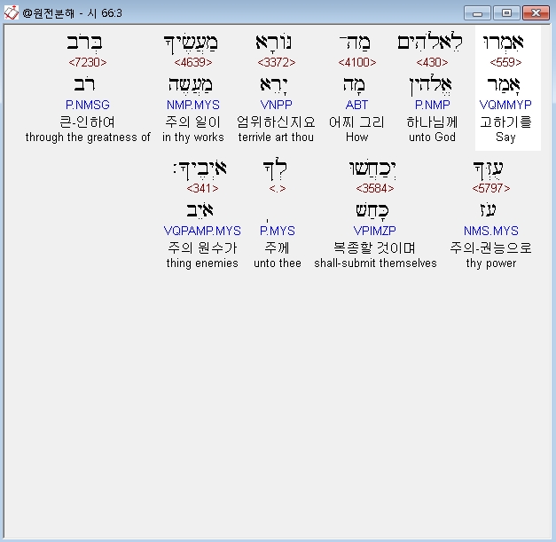 히브리어구약BHS,3 אִמְרוּ לֵאלֹהִים מַה־נֹּורָא מַעֲשֶׂיךָ בְּרֹב עֻזְּךָ יְכַחֲשׁוּ לְךָ אֹיְבֶיךָ׃