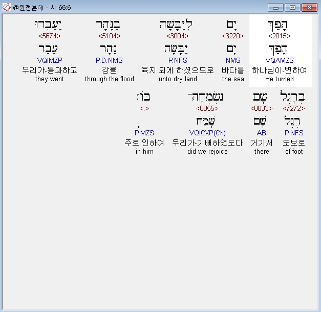 히브리어구약BHS,6 הָפַךְ יָם לְיַבָּשָׁה בַּנָּהָר יַעַבְרוּ בְרָגֶל שָׁם נִשְׂמְחָה־בֹּו׃
