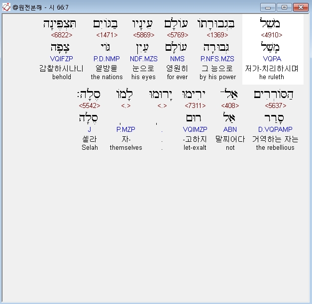 우리말성경,7 그분이 그 능력으로 영원히 다스리시고 그 눈으로 이방 민족들을 지켜보시니 반역자들은 들고 일어나지 말라. (셀라)