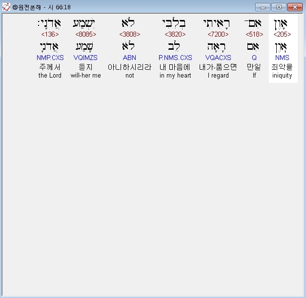 히브리어구약BHS,18 אָוֶן אִם־רָאִיתִי בְלִבִּי לֹא יִשְׁמַע אֲדֹנָי׃