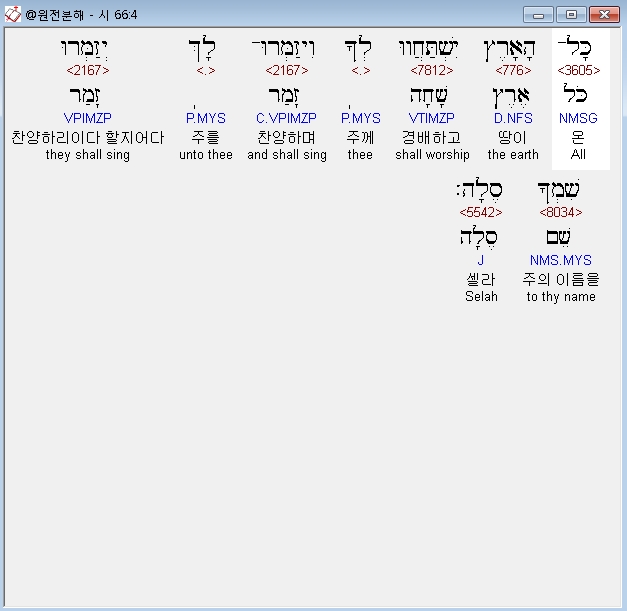 히브리어구약BHS,4 כָּל־הָאָרֶץ יִשְׁתַּחֲווּ לְךָ וִיזַמְּרוּ־לָךְ יְזַמְּרוּ שִׁמְךָ סֶלָה׃