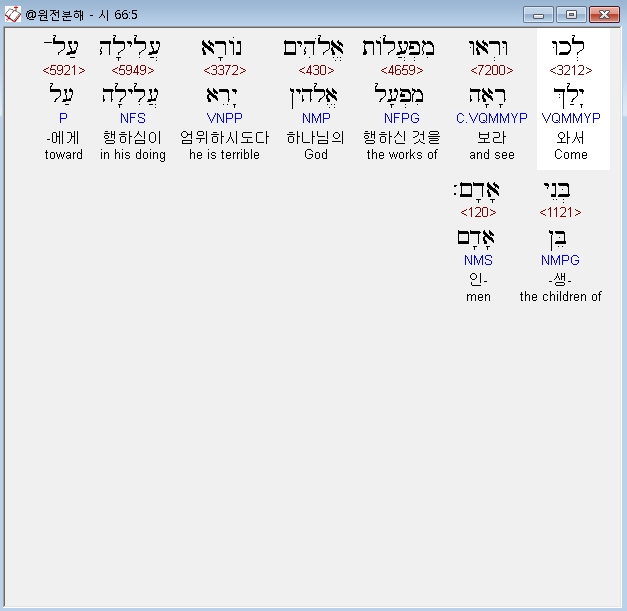 히브리어구약BHS,5 לְכוּ וּרְאוּ מִפְעֲלֹות אֱלֹהִים נֹורָא עֲלִילָה עַל־בְּנֵי אָדָם׃