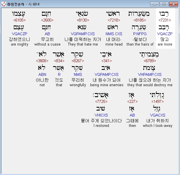영어NASB,4 Those who hate me wiYout a cause are more than the hairs of my head; Those who would destroy me are powerful, being wrongfully my enemies, What I did not steal, I then have to restore.