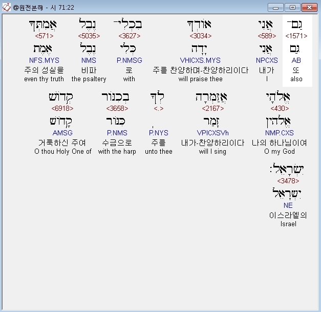 히브리어구약BHS,22 גַּם־אֲנִי אֹודְךָ בִכְלִי־נֶבֶל אֲמִתְּךָ אֱלֹהָי אֲזַמְּרָה לְךָ בְכִנֹּור קְדֹושׁ יִשְׂרָאֵל׃