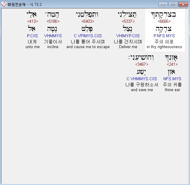 히브리어구약BHS,2 בְּצִדְקָתְךָ תַּצִּילֵנִי וּתְפַלְּטֵנִי הַטֵּה־אֵלַי אָזְנְךָ וְהֹושִׁיעֵנִי׃