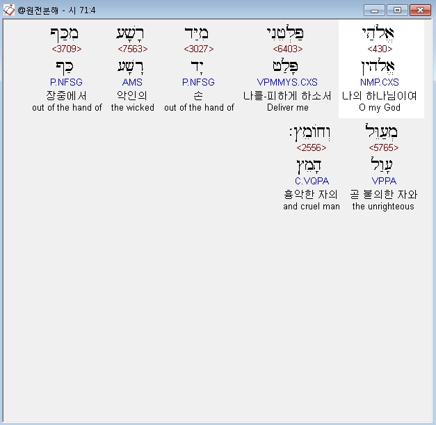 히브리어구약BHS,4 אֱלֹהַי פַּלְּטֵנִי מִיַּד רָשָׁע מִכַּף מְעַוֵּל וְחֹומֵץ׃