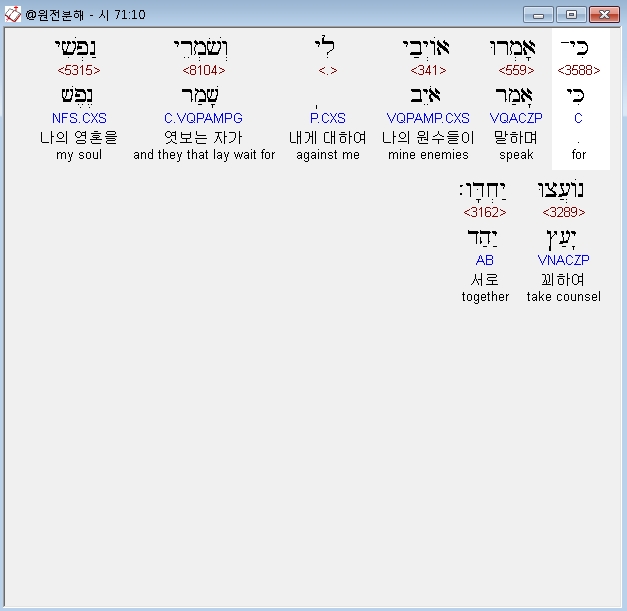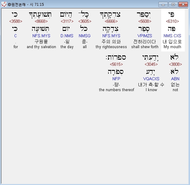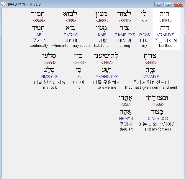 | 히브리어 시편 72편 전체 원어 원문 성경 공부 주석 강해 설교 해설 해석 (0) | 2020.10.12 |