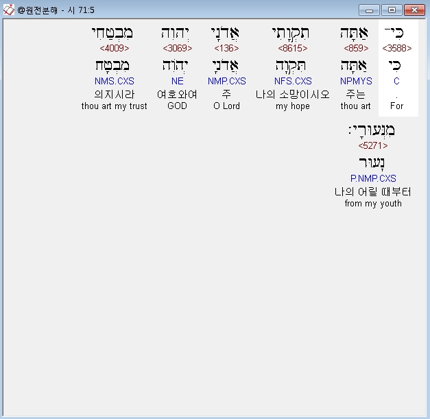 히브리어구약BHS,5 כִּי־אַתָּה תִקְוָתִי אֲדֹנָי יְהוִה מִבְטַחִי מִנְּעוּרָי׃