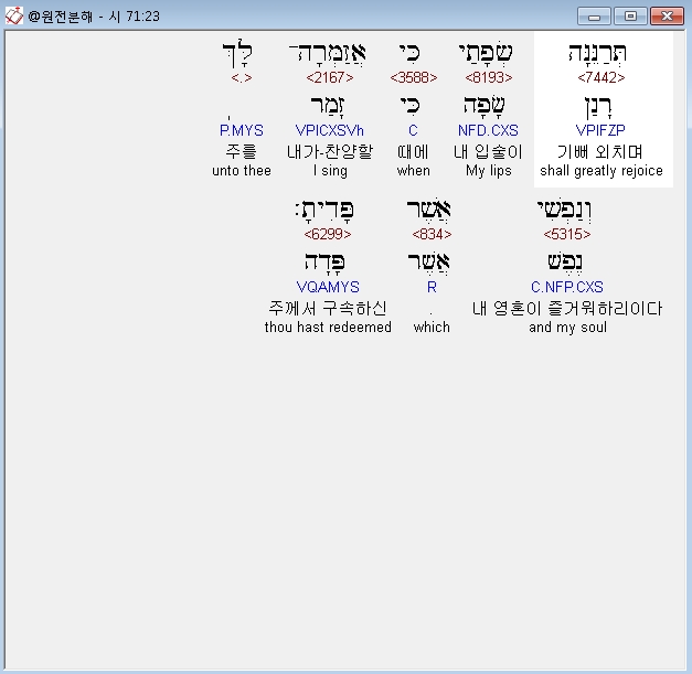 히브리어구약BHS,23 תְּרַנֵּנָּה שְׂפָתַי כִּי אֲזַמְּרָה־לָּךְ וְנַפְשִׁי אֲשֶׁר פָּדִיתָ׃