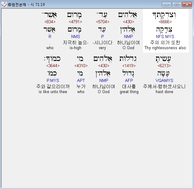 히브리어구약BHS,19 וְצִדְקָתְךָ אֱלֹהִים עַד־מָרֹום אֲשֶׁר־עָשִׂיתָ גְדֹלֹות אֱלֹהִים מִי כָמֹוךָ׃