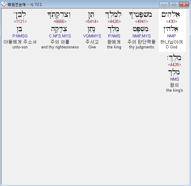 히브리어구약BHS,1 לִשְׁלֹמֹה אֱלֹהִים מִשְׁפָּטֶיךָ לְמֶלֶךְ תֵּן וְצִדְקָתְךָ לְבֶן־מֶלֶךְ׃