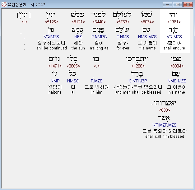 개역개정,17 그의 이름이 영구함이여 그의 이름이 해와 같이 장구하리로다 사람들이 그로 말미암아 복을 받으리니 모든 민족이 다 그를 복되다 하리로다