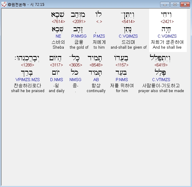 히브리어구약BHS,15 וִיחִי וְיִתֶּן־לֹו מִזְּהַב שְׁבָא וְיִתְפַּלֵּל בַּעֲדֹו תָמִיד כָּל־הַיֹּום יְבָרֲכֶנְהוּ׃
