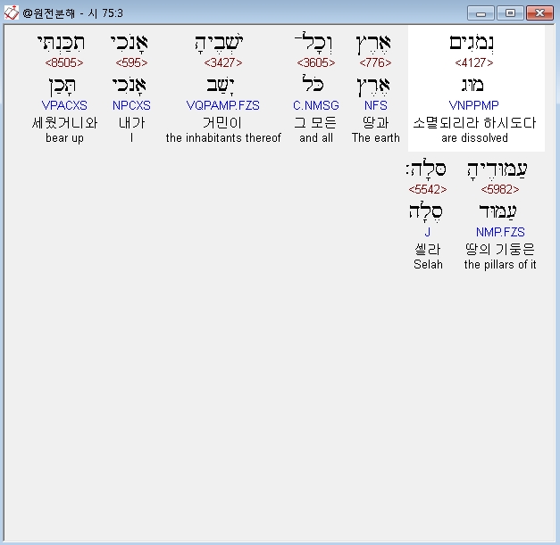 히브리어구약BHS,3 נְמֹגִים אֶרֶץ וְכָל־יֹשְׁבֶיהָ אָנֹכִי תִכַּנְתִּי עַמּוּדֶיהָ סֶּלָה׃